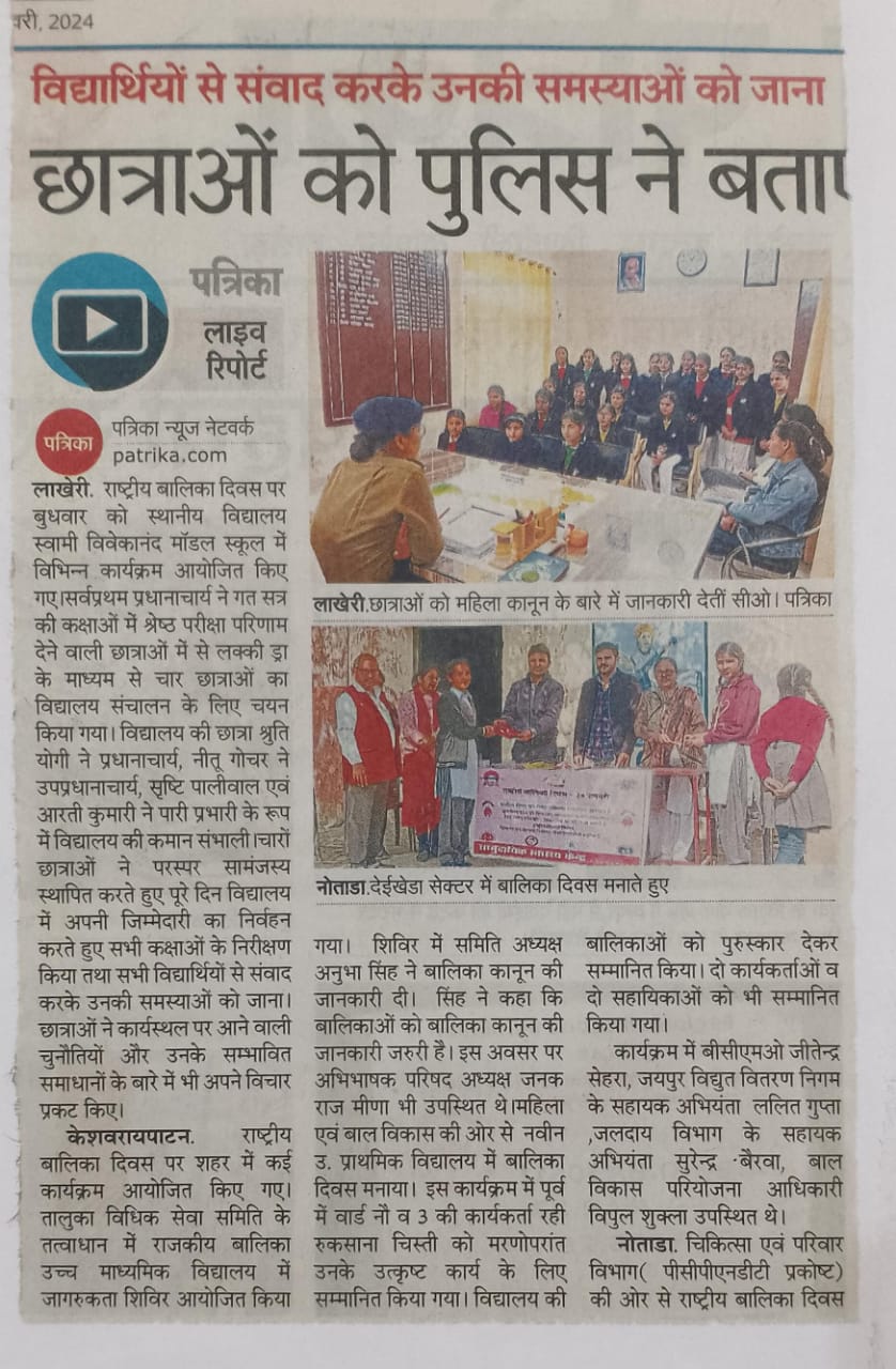 24 जनवरी को राष्ट्रीय बालिका दिवस पर स्वामी विवेकानंद मॉडल स्कूल लाखेरी में अनेक कार्यक्रम आयोजि