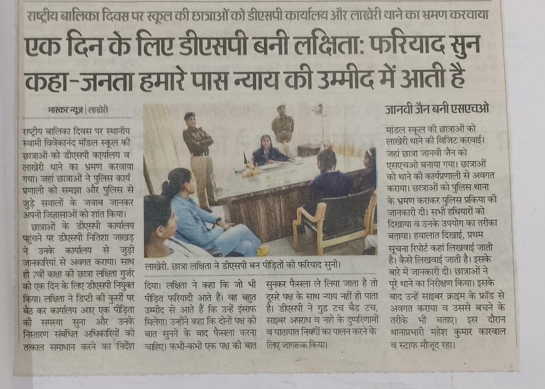 राष्ट्रीय बालिका दिवस पर स्थानीय स्वामी विवेकानंद मॉडल स्कूल की छात्राओं को डीएसपी कार्यालय व ल